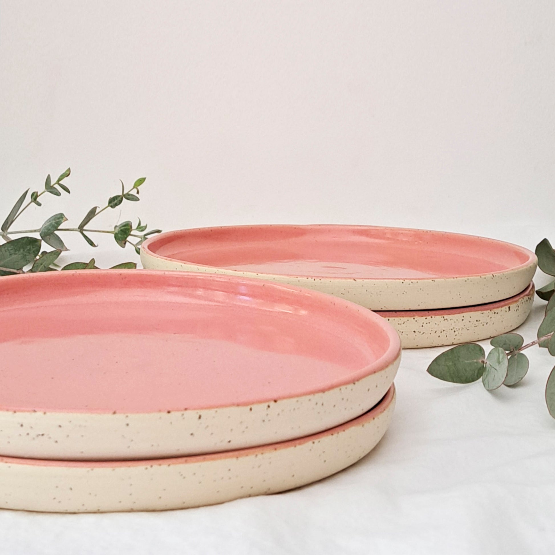 הצלחות עשויות בעבודת יד על האובניים וצבועות בגלזורה ורודה.