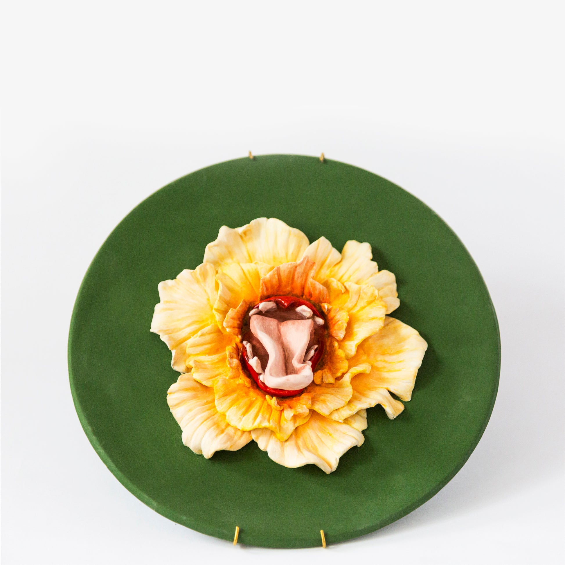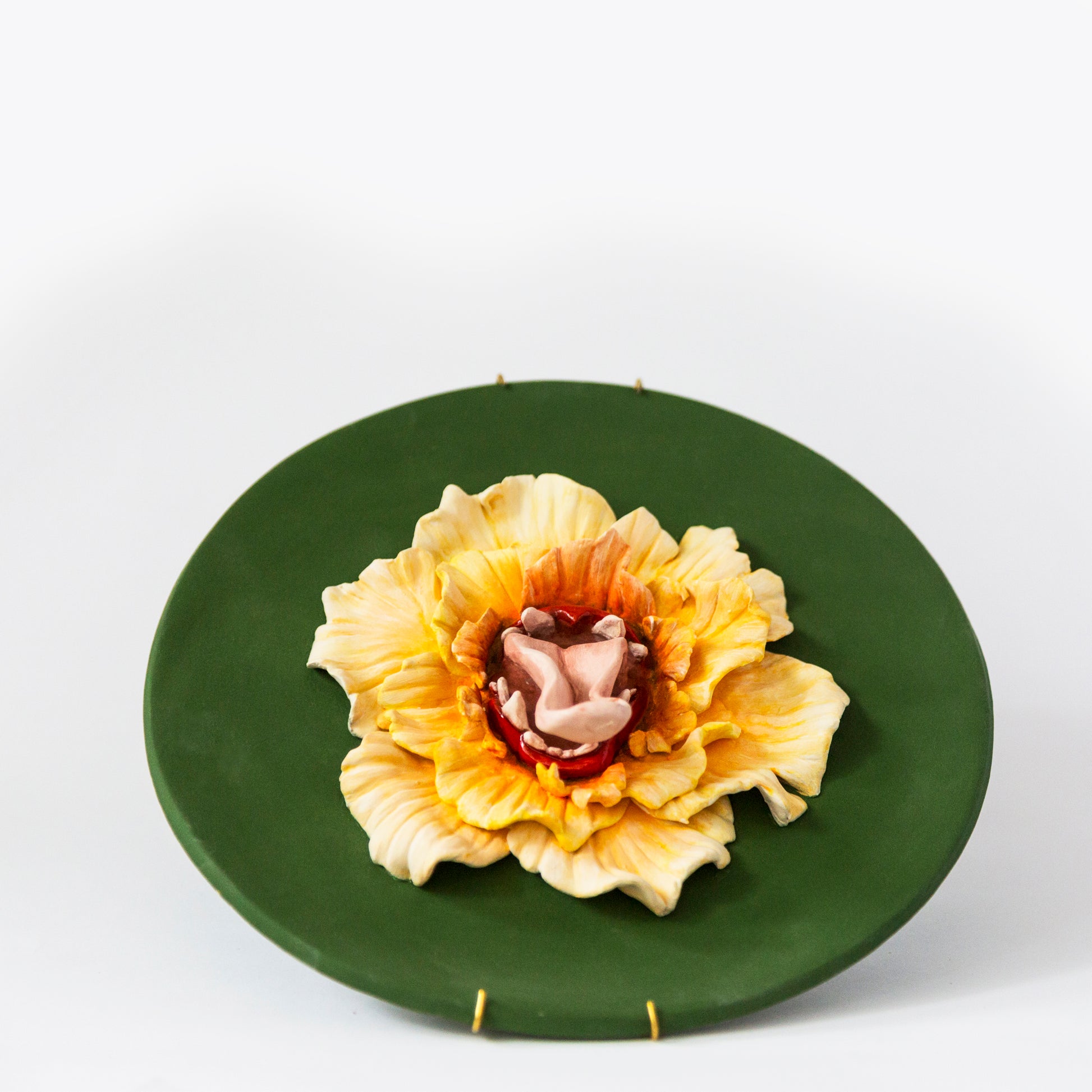 צלחת דקורטיבית לקיר, פיסול עבודת יד בחימר, צביעה ידנית בצבעי אנגוב. הצלחת מגיעה עם מתלה לקיר.